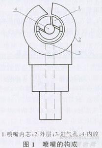 在络筒机上加装涡流喷嘴,是利用压缩空气从进气孔进入外层,通过外层分配到内芯各进气孔,内芯各进气孔的高压气流在喷嘴内腔形成转速高达百万转以上的高速涡流,当纱线经过喷嘴内腔时,纱线体外的毛羽在涡旋气流的带动下,加之前后有张力控制,回转较小,靠两者之间速度差异,将纱线体外的毛羽缠绕在纱线主体上,实现了减少毛羽,提高外观的效果。在1332M络筒机上安装涡流喷嘴,其构成见示意图1。安装方法有两种,一种是安装在张力架上,另一种是另外加装固定装置,装在纱管和导喷嘴内芯;2—外层;3—进气孔;4—内腔
