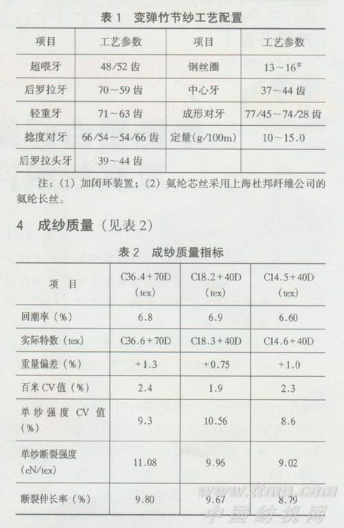 随着科学技术的进步和人民生活水平的不断提高,对产品质量和档次的要求日益提高,各种服饰面料的需求量不断增大,其主要特点是具有良好的透气性和独特的花式效果,织物表面呈现出醒目颗粒状,立体感极强,质地风格挺括而且柔软。用变弹竹节纱织造的面料穿着舒适,是牛仔布及室内装饰面料的理想面料。它的研制及生产具有较广阔的市场和发展前景。为满足市场需求,我们在FA506型细纱机上通过技术改造生产出变弹竹节纱系列产品。本文结合生产实践,对影响变弹竹节纱的因素进行了试验,探讨了提高成纱质量的措施。