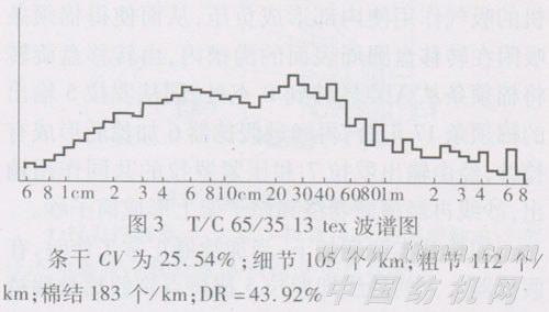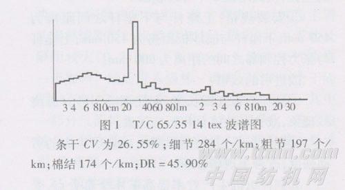 T/C 65/35 14 tex品种因粗纱机中罗拉扭振所引起的细纱波谱图在20 cm~30 cm的机械波见图1。