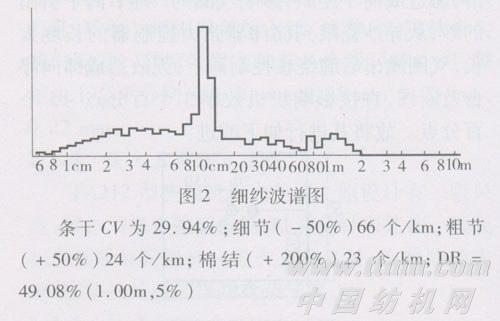 由粗纱前胶辊划伤引起的隐波,它不同于中、后罗拉扭振产生的隐波:(1)若后罗拉扭振引起,将总牵伸由6.9倍改为6.0倍;(2)若中罗拉扭振,将后区牵伸倍数由1.3l倍改为1.38倍,经改变总牵伸倍数和后区牵伸倍数所纺细纱波谱图后机械波的位置没有明显移动,仍在15 cm~60cm,因此可排除中、后罗拉扭振引起,一般就是粗纱前胶辊引起。