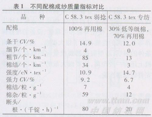 配棉不同,成纱质量明显有差异。我公司转杯纺纱机主要生产中粗号纱,配棉成分是由低级原棉与再用棉组成。低级原棉含杂较高、成熟度较差,对开清棉及梳棉工艺提出了特殊要求。再用棉对成纱强力影响较大,其中再用棉中细小杂质和疵点对纱、布质量影响更大,在开清棉、梳棉工序中,粗大杂质由于重量比棉纤维大,容易与纤维分离而排除,细小杂质,特别是带有纤维的疵点,如软籽表皮、僵棉、带纤维籽屑、棉结及黄根等,很难在开清棉清除。残留的杂质疵点包卷在纱条或附着在纱条上,使条干恶化,断头增加,棉纱棉结杂质粒数增多,从而影响成纱外观质量。因此,掌握纱线质量和原棉性质的关系十分重要。根据产品的质量要求,合理选用回花、再用棉和原棉的比例,达到既降低产品成本,又提高产品质量的要求。