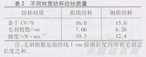 纺杯是转杯纺纱机的重要元件之一,其质量好坏直接影响到成纱水平,为了优选纺杯,分别采用铝质纺杯和钢质纺杯在C 36 tex品种上进行纺纱试验,结果见表2。