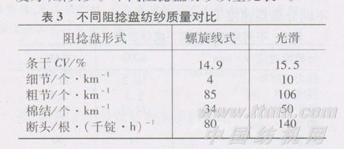 目前阻捻盘形式有光滑、四槽、八槽及螺旋线式等,它可以有效地防止纱条断头。生产中阻捻盘选用合适与否关系到纺纱是否顺利及成纱质量的好坏,生产中应根据原料以及成纱质量的要求来选择。我公司生产C 58.3 tex弱捻纱时,最初使用光滑阻捻盘,导致毛羽大量产生,断头多,纺纱困难。换用螺旋线式阻捻盘后,纱线光滑,均匀度好,断头少。不同阻捻盘纺纱质量见表3。
