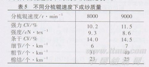 分梳辊的主要作用是对棉层进行分梳、除杂,分梳辊速度过快,不一定能显著提高分梳度,且易损伤纤维,增加落棉。c 58.3 tex专纺纱品种在不同分梳辊速度下的成纱质量见表5。