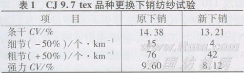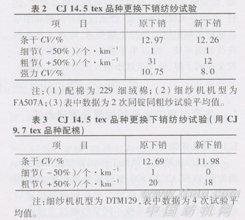 我们对这种下销在CJ 14.5 tex及CJ 9.7 te,品种上进行了连续跟踪试验,发现其在改善成纱质量方面效果明显,试验结果见表1、表2、表3。