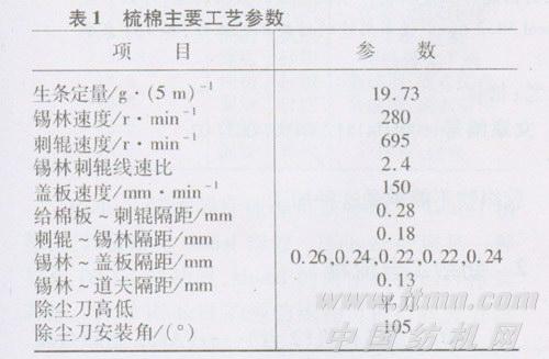 Tencel纤维经过开清棉后仍有部分纤维束,需进一步分梳,但同时要注意减少棉结和控制落棉,故采用“轻定量、低速度、紧隔距”的工艺原则。采用低盖板速度、平除尘刀大角度,以减少落棉和盖板花;采用较紧的锡林盖板隔距,以加强梳理,减少棉结。生产过程中,棉网从锡林转移至道夫时,易出现棉网缠绕道夫或在道夫上形成破网。通过正交试验发现,温度、相对湿度和锡林刺辊线速比是几个主要因素。通过合理配置工艺,严格控制梳棉车问的温湿度,并采用斩刀剥棉后,Ten—cel纤维能顺利地从刺辊转移到锡林上,在锡林、道夫上形成清晰的棉网,梳棉生产得以顺利进行。梳棉主要工艺参数见表l。