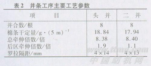 由于牛仔布纬纱对条干均匀度要求比较高,所以采用两道并条,8根并合,以减小重量不匀,使牵伸倍数接近并合数,车速适当降低。为提高纤维伸直平行度,采用较大的二并总牵伸,同时,为消除棉条中纤维的后弯钩,采用了较小的二并后区牵伸。利用FA311型并条机四上四下附导向辊压力棒曲线牵伸形式,可控制纤维在牵伸区平稳运动,有利于改善熟条条干。并条工序主要工艺参数见表2。