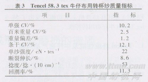 卷绕罗拉与引纱罗拉问的张力牵伸应以保证卷装成形良好为宜,选定卷绕罗拉线速度为70.2m/min,张力牵伸为1倍。根据所纺转杯纱的纱号和用途,捻度为57捻/10 cml。Tencel 58.3 tex转杯纱成纱质量指标见表3。