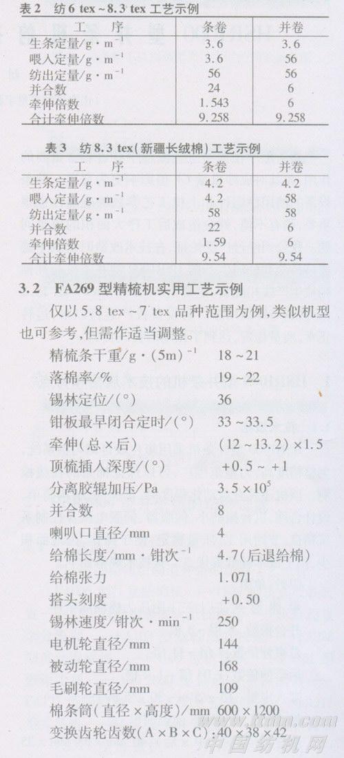 今以FA269型精梳机为例,准备工艺以条卷 — 并卷为例,以实纺CJ 7.3 tex示例(5.8 tex至7.3 tex范围内均可参考)。