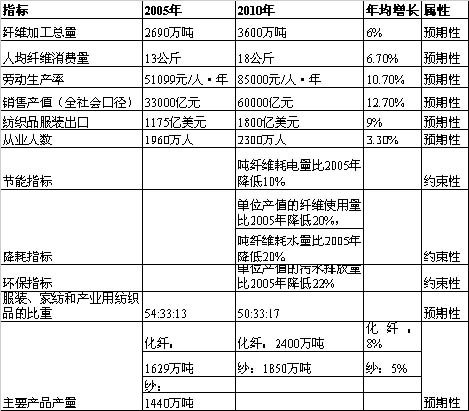 到“十一五”末,我国纺织行业自主创新能力得到较大提高,形成一批具有自主知识产权、有一定国际影响力的技术和知名品牌;产业结构进一步优化,整体技术装备水平大幅提高;低效率、高能耗、高污染的低水平初加工能力得到有效限制和淘汰,节能降耗、环境保护取得实质性进展;在更高层次上形成以质量、创新和快速反应为主体的产业竞争优势,构筑起符合走新型工业化道路要求的产业发展模式。