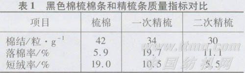 (3)精梳工序。随着人们审美水平的不断提高,用户对小比例色纺纱的质量要求越来越严格,要求减少小比例色纺纱布面上的黑色棉结,有的用户甚至要求布面上没有黑色棉结。对于用黑色棉调色的纯棉或黑色棉与化纤混纺的所有品种,都使用了黑色棉精梳条进行生产,这在一定程度上减少了布面上的黑色棉结,但用户仍然反映布面上的黑色棉结较多。为此我们采用了双精梳工艺。双精梳工艺与一次精梳工艺相比短绒率降低,黑色棉结减少,并且黑色棉结颗粒非常小。使用黑色棉双精梳条生产的麻灰纱,颜色均匀,布面上的黑色棉结极少、黑色棉结颗粒极小,用户比较满意,但工艺流程很长,精梳工序因有二次落棉,吨纱用棉量很高。黑色棉条的质量情况见表1。
