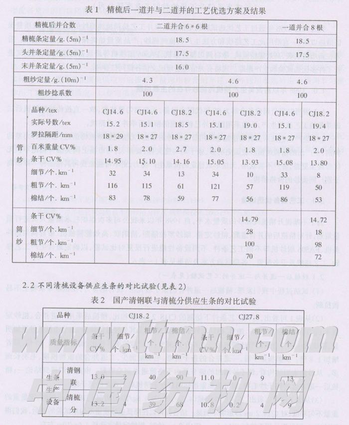 我公司自1998年通过工艺优选试验确定精梳后单并工艺纺精梳纯棉纱的工艺路线及质量保证措施以来,一直沿用此工艺路线和方法生产精梳纯棉纱,产品质量始终保持了良好的效果。后来在新增清钢联、高效能精梳机、带自调匀整并条机、FA506细纱机等新设备的情况下,我们又进行了许多优选试验和生产跟踪。现将有关情况整理成文供各位同仁参考。