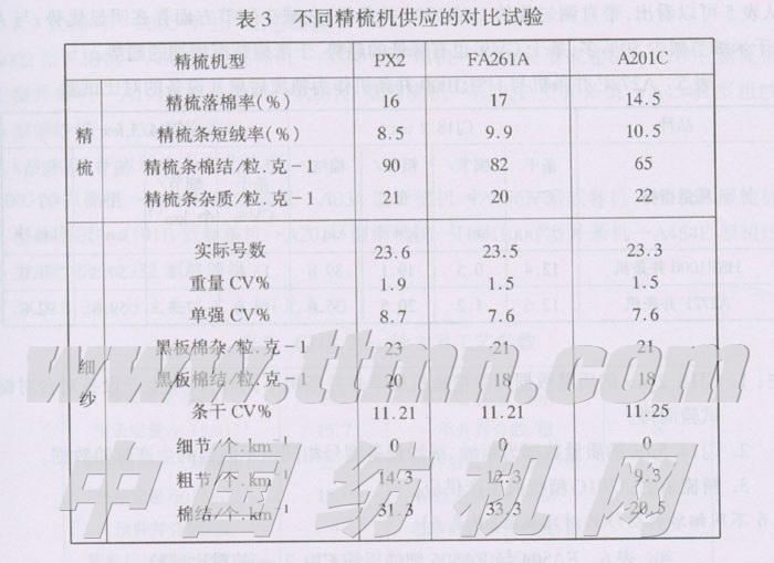 从表3可以看出,PX2、FA26lA高效能精梳机与A201C精梳机相比,所纺成纱的千米棉结增加50%多,千米粗节增加30%多,精梳条棉结增加30%多。