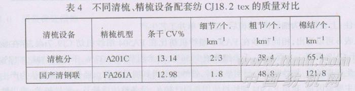 在表2、表3试验的基础上,我们又跟踪了清梳分供A201C精梳机与清钢联供FA261A精梳机的纺纱生产质量情况(见表4)