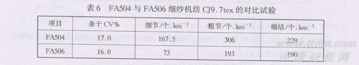 从表6可以看出,相同粗纱在FA506细纱机纺比在FA504细纱机纺C39.7tex,存在显著优势,条干CV%降低1个百分点,千米细节减少56%,千米粗节减少37%,千米棉结减少17%。尤其是从生产现场看,细纱断头得到明显好转,管纱毛羽得到明显改善。经分析,我们认为产生这种结果的主要原因是,我司FA504.细纱机使用年限已较久,设备整体质量及一致性较差,难以胜任纺CJ9.7tex这样的高支纱。这个试验同时也表明,国产新一代的FA506细纱机其纺纱质量提高了一个档次,不作任何特殊改进、改造,就能用细绒棉正常生产CJ9.7 tex、CJ8.3tex等高支纱。