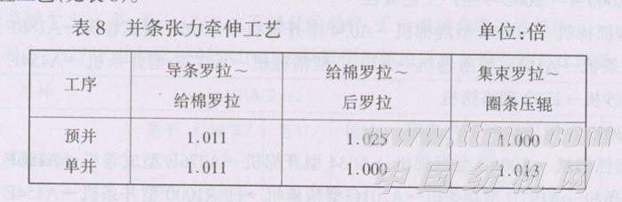 4.3.2合理配置导条罗拉一给棉罗拉、给棉罗拉一后罗拉、集速罗拉一圈条压辊间的张力牵伸,减小意外牵伸,使牵伸差异率控制在1%以下。上机时,逐道反复试验比较,确定了比较合理的张力牵伸配置工艺(见表8).