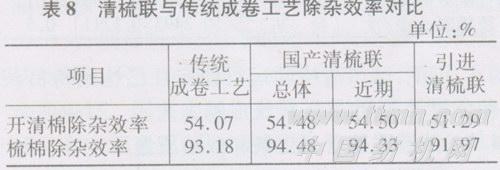 根据各纺织厂的数据统计,清梳联与传统成卷工艺的实际除杂效率见表8。