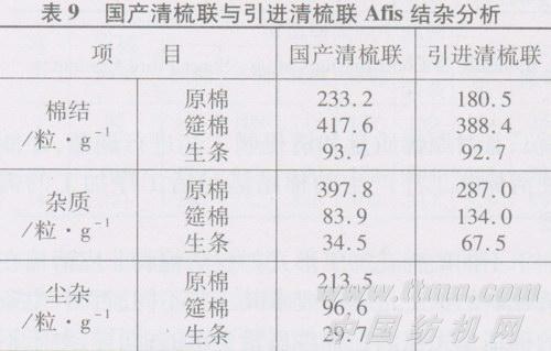 引进清梳联与国产清梳联Afis结杂对比分析见表9,其中引进梳棉机机型分别为C4型、C50型、DK760型、C300型、MK50型等。