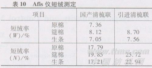 (2)由表6可知,国产清梳联与引进清梳联的短绒增加率都在正常范围内,特别是近期国产清梳联的质量有所改善。