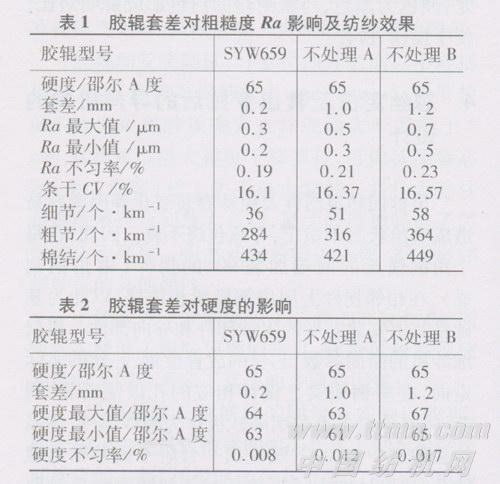 胶辊硬度均匀度和胶辊表面粗糙均匀度主要是由胶辊综合分散度、胶辊套差来决定。胶辊综合分散度是考核胶辊内在质量的重要指标,高分散度的胶辊其胶料补强、填料分散均匀,而分散度低的胶料内部含有微小气孑L或填料密集,胶料相应减少,产生应力集中、硬度不匀,易造成结构破裂,产生气孔、毛刺,胶辊表面粗糙度不匀。而sYW659型胶辊其分散度高达9级以上,胶辊应力极小,有利于胶辊的硬度均匀。由于sYW659型胶辊采用微套差,胶辊硬度不匀率和粗糙度不匀率与其他套差胶辊相比不匀率低。我们对三种不同套差的不处理胶辊(分散度均在9级以上)的表面粗糙度、硬度进行了测试对比,并在C14.5 tex品种上进行了纺纱对比,结果分别见表1和表2。