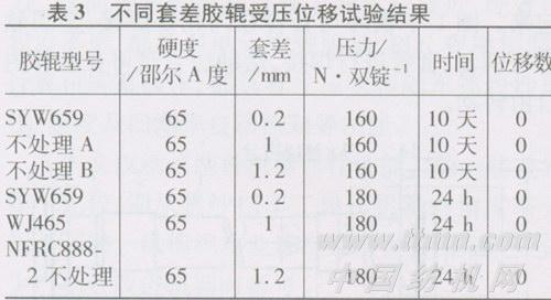 从理论上讲胶辊套差越大,胶管和胶辊轴承的抱合力越大,但套差过大,胶辊内应力过大,影响胶辊的弹性,缩短使用寿命,因此,套差不宜过大。为了增加胶管对胶辊轴承的抱合力,缩小套差减少胶辊的内应力,目前采用铝衬套胶辊,基本能解决这个问题。但由于铝衬套胶辊成本高,加上套制需专用套制工具,在套制时,一次到位率差,胶辊制作困难。而sYW659型微套差胶辊采用传统的套制工具,套制成功率高,简便易行。在重加压情况下会不会产生位移,这也是衡量微套差胶辊的一个重要指标,也是微套差胶辊研制是否成功的一个关键所在。为此,我们对SYW659型微套差胶辊与其他不同套差不处理胶辊在同硬度、同锭、同压力条件下进行运转对比试验,取10锭进行测试,结果见表3。