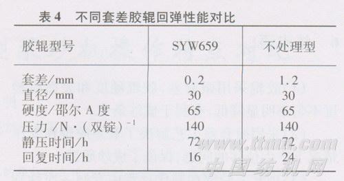 从表4可以看出,胶辊的回弹性与胶辊套差、硬度关系密切,套差小、硬度低,回弹时间短。良好的回弹性是衡量胶辊的一个重要指标,sYW659型微套差胶辊具有较高的弹性、较强的弹性回复能力。