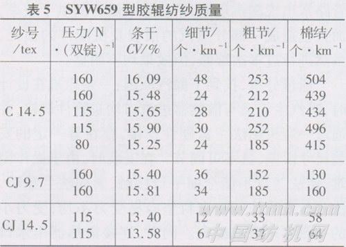 我们将sYW659型微套差胶辊在CJ 9.7 tex、C 14.5 tex、CJ 14.5 tex品种上,在同锭同粗纱、不同压力条件下进行纺纱试验,结果见表5。