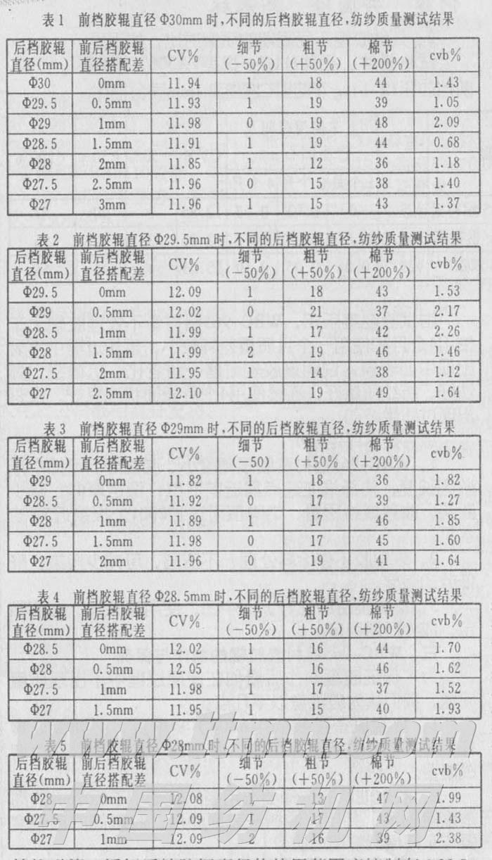 我厂对后档胶辊直径的配制非常重视,对成纱质量的各项指标要求极为严格,经过几年的应用实践和详细的对比试验分析。棉纺后档胶辊直径择优配制,可以提高成纱质量,减少粗、细节以及减小锭间cvb值。