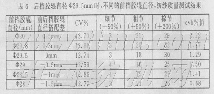 在气压摇架上,为了掌握前后档前胶辊直径搭配与成纱质量关系,我们订制了φ30mm、φ29.5mm、φ29mm、φ28.5mm、φ28mm六档前胶辊直径,因后档胶辊与后下罗拉是斜面接触加压的,如果调换后档胶辊直径,需要调整上罗拉座的位置,这样会造成试验数据之间的差异,不能完全反映实际值,所以我们将后档胶辊直径订制为φ29.5mm与不同的前档胶辊直径进行对比,在J14.6k品种上,采用同台、同锭、同粗纱、同胶辊型号、同新旧程序.测试结果见表6。