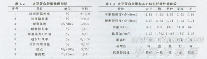 大豆蛋白纤维的基本物理性能指标及与其它纺织纤维的性能比较,分别如表1.2和表1.3所示。