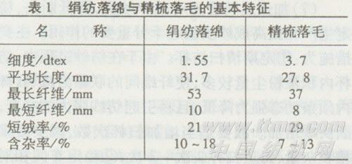 丝/毛混纺转杯纱使用的原料为绢纺落绵和精梳落毛。绢纺厂的落绵有老工艺落绵(A落绵)和新工艺落绵(s落绵)两种,混用时以A落绵为主,S落绵为辅。绢纺落绵的细度与棉纤维相近,但纤维长度差异大,含杂高,并丝多;毛纺厂的精梳落毛同绢纺落绵相比又显得长度短、短绒率高,纤维粗硬,刚性大,纤维间抱合力小。两种纤维的基本特征见表1。
