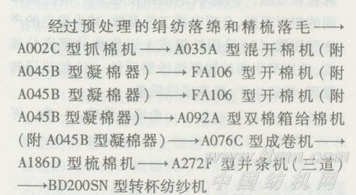为了提高绢纺落绵和精梳落毛的可纺性能,我们除了合理调节和搭配原料外,还分别对绢纺落绵和精梳落毛进行了预处理,绢纺落绵用SN抗静电剂、平平加、甘油等助剂溶液喷洒,精梳落毛用和毛油、平平加等助剂溶液喷洒,使原料的回潮率能达到13%~16%,两种原料给油加湿后堆放16 h~24 h后混用。另外,为了保证成纱混纺比的准确性,配棉时要考虑两种原料在生产过程中落纤、落杂的不同,注意两种原料的实际用量,我们生产65/35 40 tex丝/毛混纺纱原料用量配比为62/38。