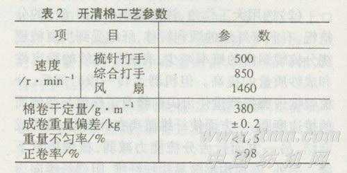 清棉工序主要是加强混和与除杂,贯彻“均匀混和、多松少打、早落、防粘”的工艺原则,要求装箱高低一致,勤抓少抓,均匀抓取,充分发挥棉箱机械的作用,达到均匀混和;合理选用打手型号,调整其速度及有关工艺参数,增加纤维的开松度,多落杂质;适当加重紧压罗拉压力,防止粘卷。同时,注意统计落杂中两种纤维的含量分析,以便于合理配棉,保证混纺比。开清棉有关工艺参数见表2。