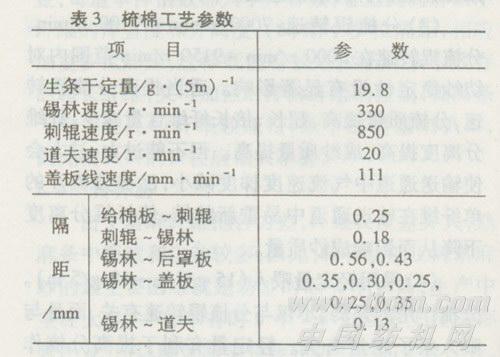 梳棉工序关键是加强分梳和除杂,在保证排除绵粒和尘杂的前提下少落可纺性纤维,保证成纱混纺比的准确性。由于羊毛弹性大,纤维间抱合力小,棉网易破,喇叭口易堵,为此可适当降低道夫速度,减小棉网张力,加装胶圈导棉装置,生条定量偏轻掌握,以便于解决成网成条的难题。梳棉有关工艺参数见表3。