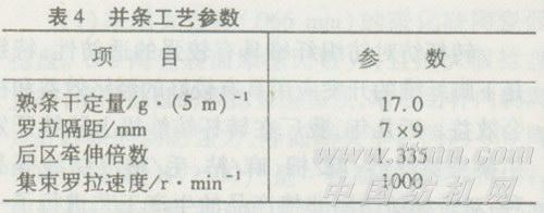并条工序采用三道并合,适当加大胶辊压力,合理配置罗拉隔距和后区牵伸倍数,保证混和均匀,降低熟条条干不匀率,提高条干均匀度。为防止拥条、堵条,熟条定量偏轻控制且适当降低集束罗拉速度。并条有关工艺参数见表4。