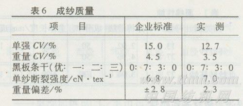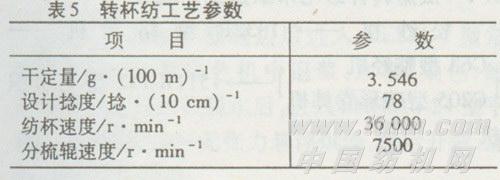 成纱捻度在保证单纱强力的情况下偏小掌握,以防止成纱弹性收缩。纺杯选用直径为66mm的大纺杯,适当提高纺杯转速,增强纤维的凝聚力。为避免或减少绕分梳辊现象,保证纤维快速转移,采用OK一37齿条式分梳辊,并通过对比试验,优选合适的分梳速度。采用直径较大的阻捻盘,增加阻捻效应,保证纺纱段的捻回数,增加强力,稳定开台,降低断头。