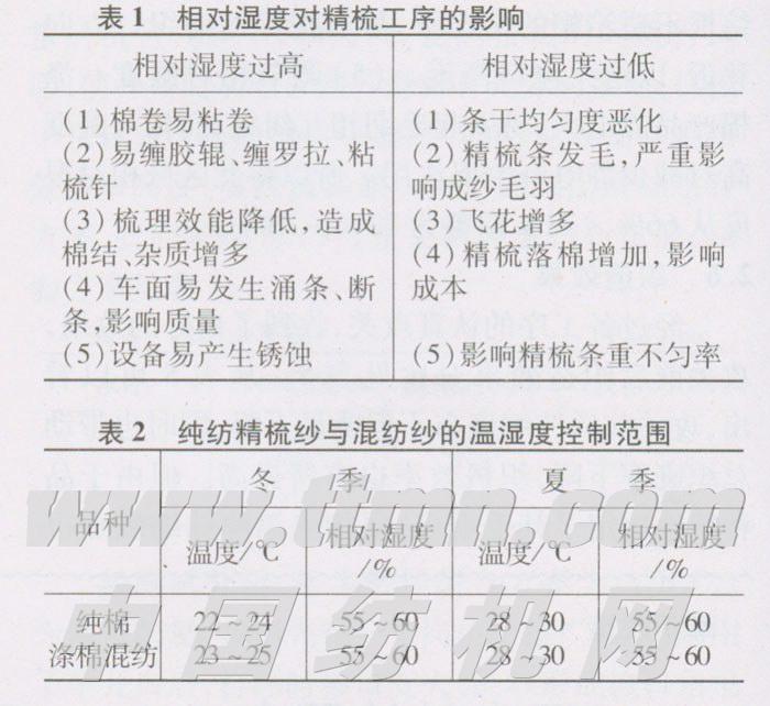空气的含湿量与同一温度下的饱和含湿量之比称为相对湿度。其表达式为Φ=[d/d(饱)]×100(%),相对湿度过高、过低对精梳工序质量的影响见表1,相对湿度为57%、58%、59%时精梳效果较好。纺制精梳纯棉与涤棉混纺产品时的温湿度控制范围见表2。