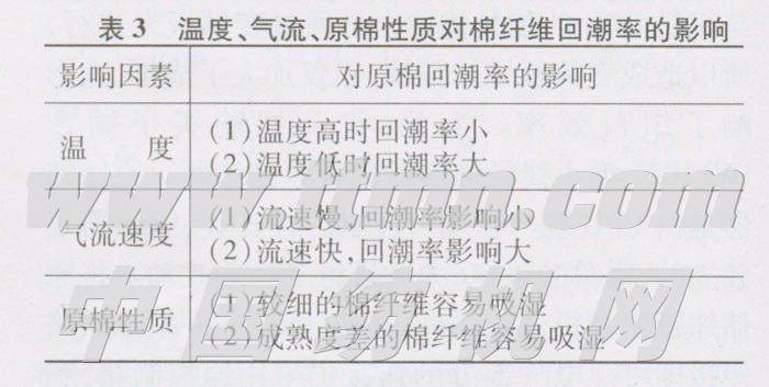 纤维回潮率与车间相对湿度、温度、周围空气的流速和原料性质等因素关系密切,尤其相对湿度是影响回潮率的主要因素。温度、气流速度和原棉性质对棉纤维回潮率的影响见表3。