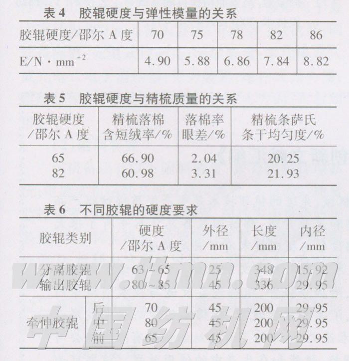 曾以A201C型精梳机上的胶辊作过试验,见表4说明。关于胶辊硬度与精梳质量的关系,也在A201C型精梳机上做过对比试验,详见表5所示。不同胶辊的不同硬度要求见表6所示。