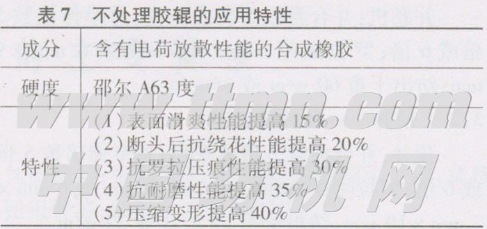 目前国内已经逐步使用不处理胶辊,不处理胶辊可在表面不处理情况下使用,由于成纱质量好,故深受用户欢迎。兹以美国Armshtrong公司的J-463型软弹胶辊为例,将其物理与应用特性列于表7。
