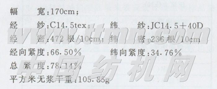 为提高产品的附加值,用新产品开拓市场,我公司在1515型织机上以普梳纯棉14.5tex纱作为经纱、JCl4.5+40D的氨纶包芯纱为纬纱成功开发出了具有良好弹性的有梭宽幅弹力布。