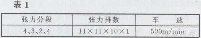 在整经工序我们采用1452A(G)~160型整经机,其工艺路线以“低速,中张力,小伸长,保弹性”为原则,控制整经张力,力求达到片纱张力、排列、卷绕三均匀,并做好断头操作及清洁工作,整经断头实测1.09/百根•万米。具体工艺见表1。