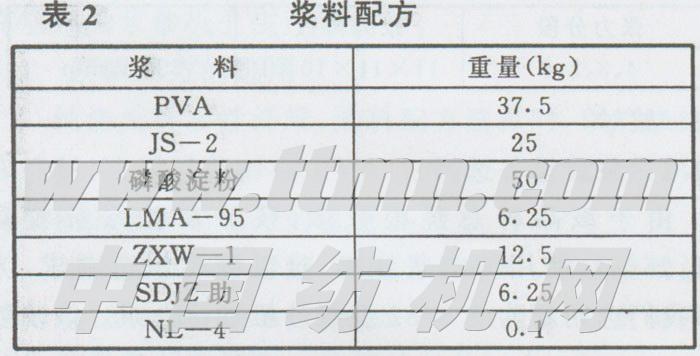由于该品种总经根数多,浆纱覆盖系数较高(63.26 9/6),使用传统浆纱机,难以满足织造要求,为此,我们选用新购的S432型浆纱机进行上浆。该浆纱机双浆槽,双浸四压,压浆辊硬度为80-82D(邵),压浆力范围0—40kN,其大小可根据车速自动调节。张力系统和浆槽,烘筒的温度均由PLC电脑进行自动控制,回潮测量控制仪能根据烘燥能力而调节车速,以保持纱线的回潮率恒定。