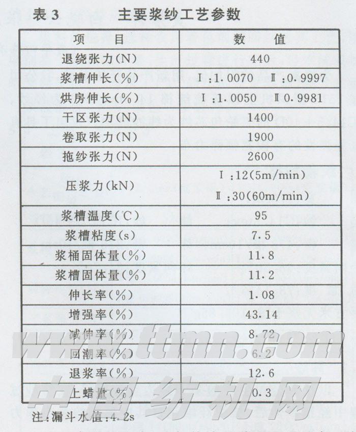 6.2浆纱应以“高浓低粘,适当加大压浆辊压力,被覆兼顾渗透,以小张力求得小伸长,湿分绞,后上蜡”的工艺路线,贴伏毛羽,改善开口清晰度,降低布机断头。