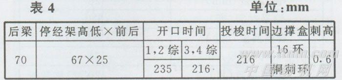 4.4.2采用“双踏盘二次开口,早开口,晚投梭,高后梁”的工艺路线,增大上下层经纱的张力差异,有利于打紧纬纱的同时可以减少梭子进出梭口与经纱的摩擦机会,减少纬缩并可降低经纱断头,提高布机效率。具体织机工艺参数见表4。