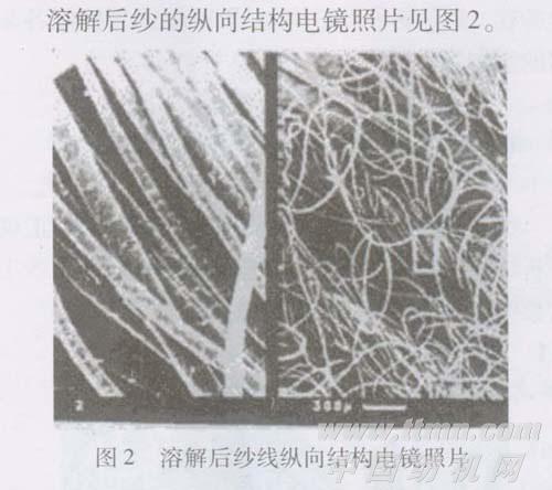 根据纤维原料和成纱的溶解试验,选择适当的条件对织物进行溶解。根据混纺纱的结构,除了少量维纶作为包缠纤维分布在纱的外层,大部分维纶纤维集中在纱的内部,所以纱的溶解要比纤维难度大,所用的时问长。而织物由于厚度大、密度大、紧度大、交织点多,维纶居于织物内部,与纱相比更不易溶解,即使溶解也需要较长的时间才能渗透出来,所