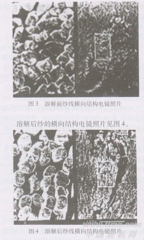 由图4可以看出,溶解后纱的横截面内几乎全部是截面呈圆形的羊绒超短纤维(横截面呈扁圆形是因切片过程中纱受挤压所致),这也吻合了纱的成分测试结果,羊绒含量高达98.23%。同时也可以看出,维纶溶解以后,纱的内部产生空隙,纱的结构变得更加松散,这是溶解后纱强下降的主要原因。
