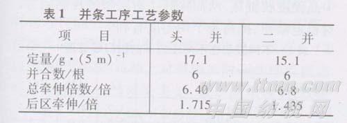 针对玉米纤维导电性较差,纤维蓬松等特点,并条工序采用“重加压,中定量,低速度”的工艺原则,减少生产中的“三绕”和堵塞现象,同时合理配置牵伸,既要保证熟条中纤维的伸直平行,又要提高熟条的条干均匀度。并条工序主要工艺参数如表1所示。