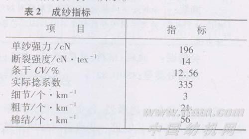针对玉米纤维弹性较好以及成纱表面毛羽较多的特点,络筒工序在保证成形良好的前提下,采用了较小的张力,槽筒转速为2700 r/min,同时合理选配电子清纱器的工艺参数。通过采用上述工艺措施,生产的玉米纤维与Modal纤维50/50 14tex混纺针织用纱达到了用户的质量要求。其成纱主要指标如表2所示。