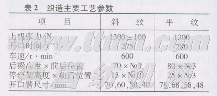 采用ZA205i-190型喷气织机织制。针对麻维混纺纱单强CV高、毛羽长的特点,织造工艺应用“小张力、早开口、大开口、低后梁”的工艺配置。经纱张力根据工艺计算取下限,以降低因张力偏高造成细节处断头,减少断经。为保证开口清晰,减少阻纬停台,开口时间提前,引纬时间适当延迟,开口量增大,以便纬纱飞行时梭口达到最清晰状态。由于该纱线弹性差,易脆断,宜采用等张力梭口,尤其是织斜纹时采用低后梁,尽量减少上下层经纱张力差异,避免开口运动时因纱弹性差,承受张力较大的片纱断一撮和因经纱毛羽长造成张力小的片纱粘连导致开口不清,形成断疵和阻纬停车,严重影响布面质量。另外,加强温湿度控制,相对湿度宜掌握在80%~85%,以利于麻维织物织造。主要工艺参数见表2。